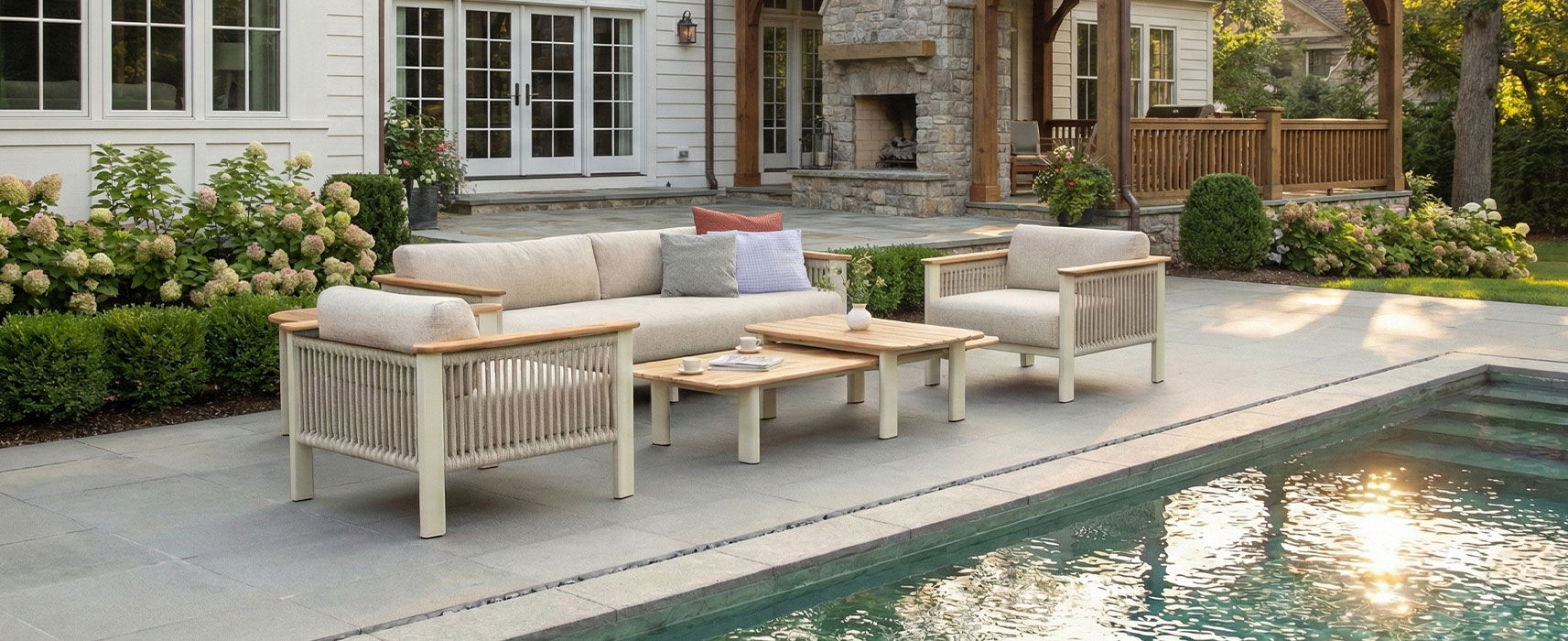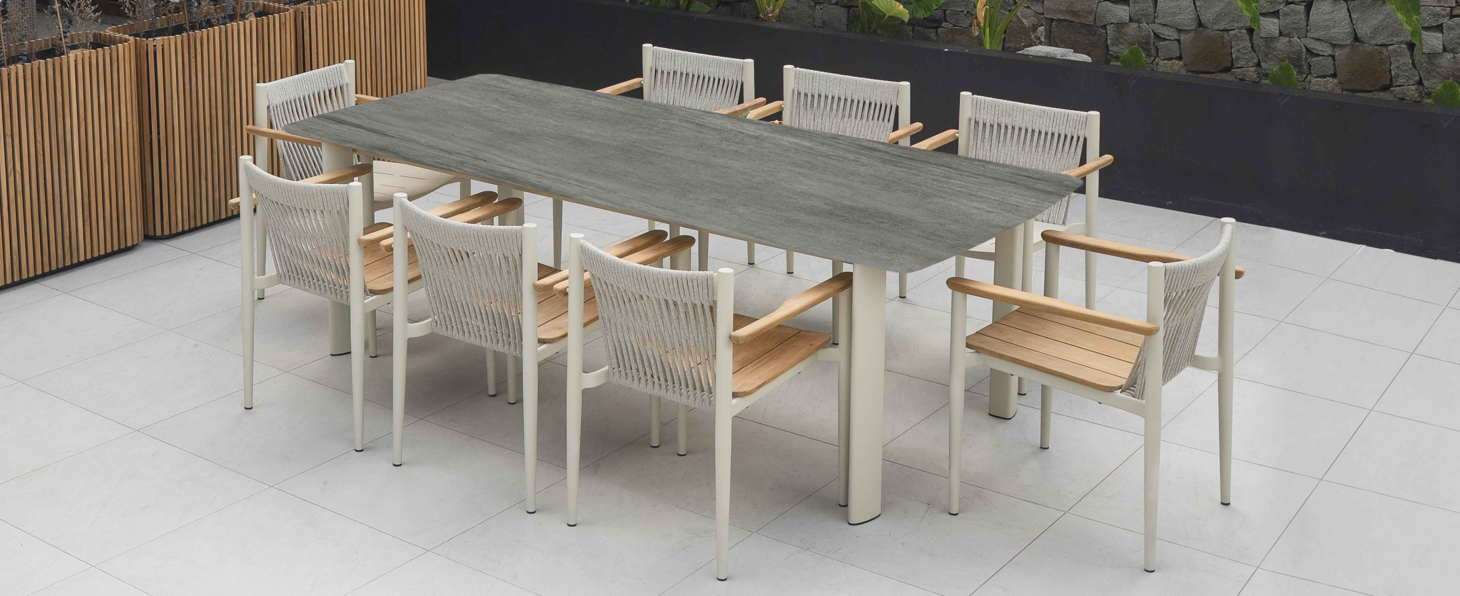 Crafted with the simplicity of aluminium, Carla Alu has an almost natural and tactile feel, enhanced by the addition of teak arms and our newly developed range of six different marine-grade flat ropes. The dining and coffee tables are available with a teak top or one of seven different ceramic tops. The dining chairs can be customized with either a teak or aluminium seat.